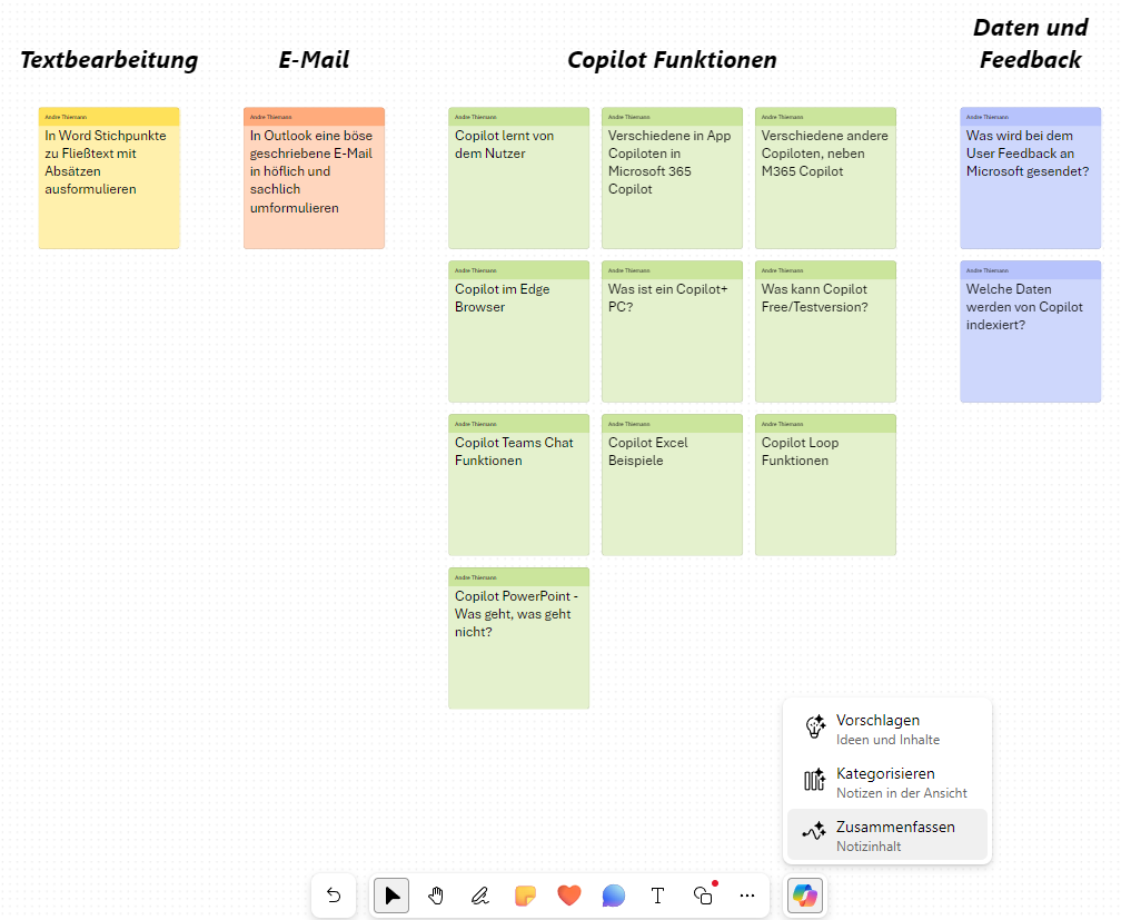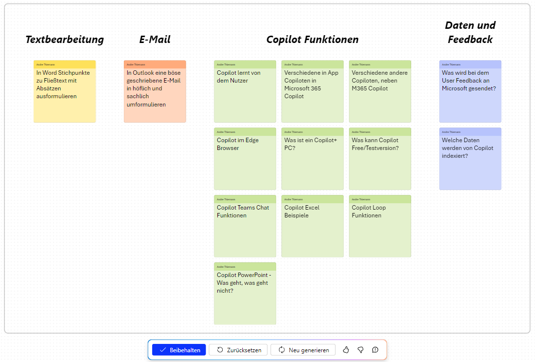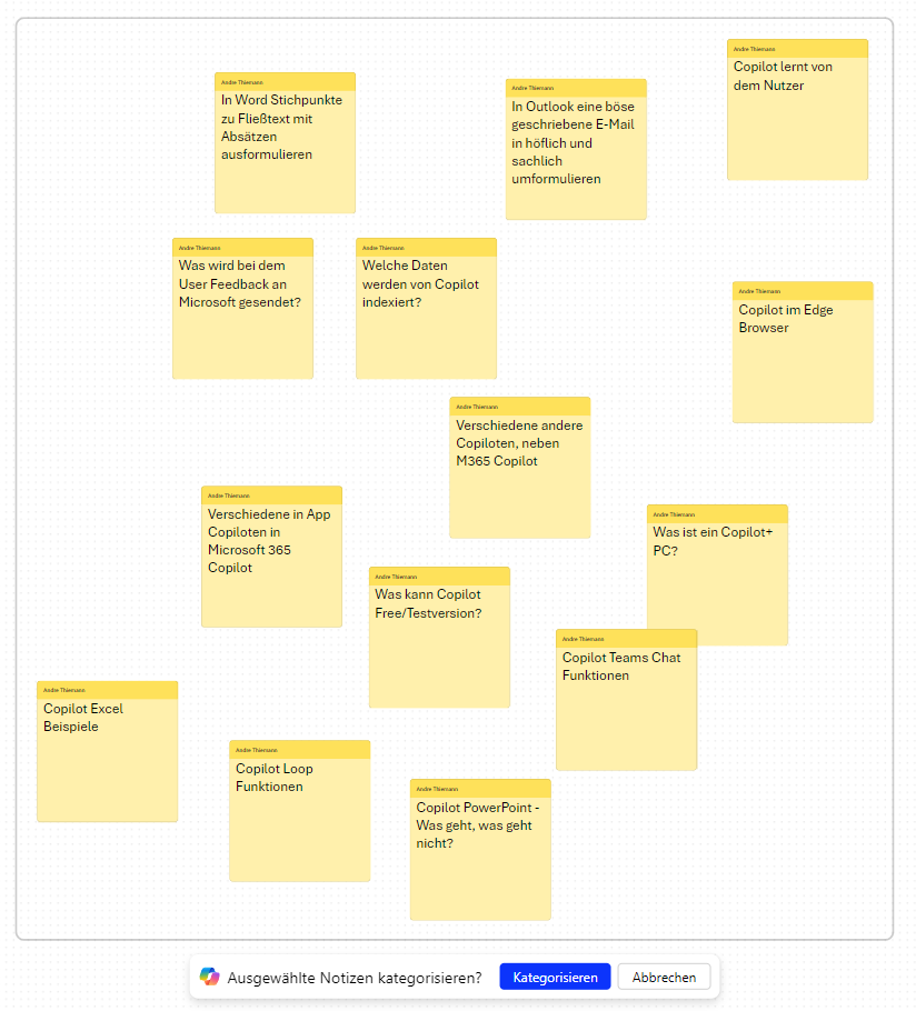 Nach einer intensiven Brainstorming-Session oder einer Retro als Team steht oft die Herausforderung an, die gesammelten Ideen zu kategorisieren. Dank der Funktion „Kategorisieren“ von Copilot keiner aus deinem Team mehr die Pause opfern, um die Ideen zu clustern. Copilot übernimmt das für euch und spart euch wertvolle Zeit.