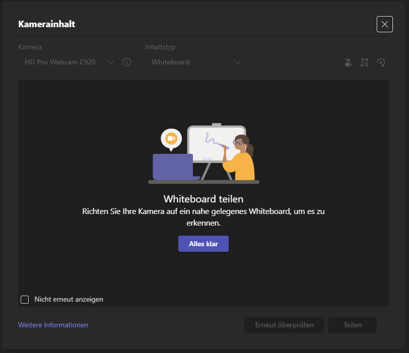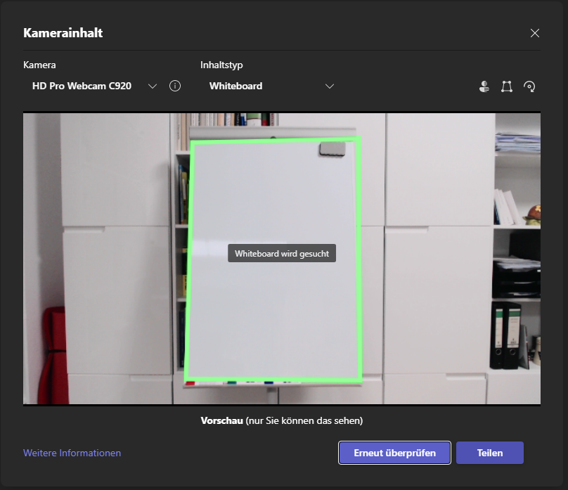 Daraufhin wird automatisch versucht ein Whiteboard vor der Inhaltskamera von Microsoft Teams zu finden und, das ist ganz wichtig, zu fokussieren. Sollte das automatische Fokussieren nicht funktionieren, bitte die Kamera leicht bewegen und auf den Button Erneut überprüfen klicken. Wie du siehst funktioniert der Fokus sogar mit einer weißen Schrankwand mit Hochglanzfronten im Hintergrund.