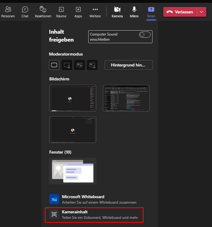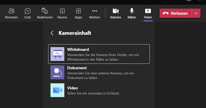 Sobald du in einem Meeting den Inhalt einer Kamera so teilen möchtest, das ein Whiteboard oder Dokument erfasst, gehst du oben rechts auf Teilen und anschließend weiter unten auf Kamerainhalt.