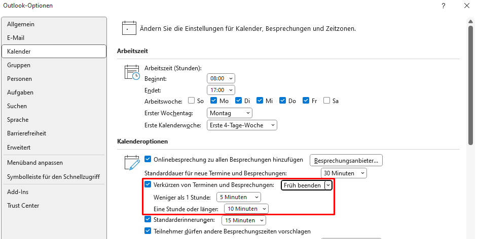 - Unter der Zwischenüberschrift „Kalenderoptionen“ findest du den Eintrag Verkürzen von Terminen und Besprechungen (roter Rahmen im Bild)