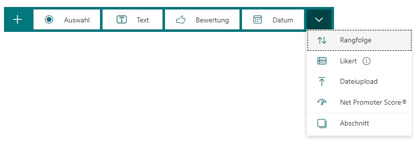 Wenn Sie auf „+ Neue Frage hinzufügen“ klicken, können Sie wählen zwischen „Auswahl“, „Text“ (Freitext), „Bewertung“ (Sterne oder Zahl), „Datum“, „Rangfolge“, „Likert“ (sehr schlecht – sehr gut) und NPS (0 bis 10).