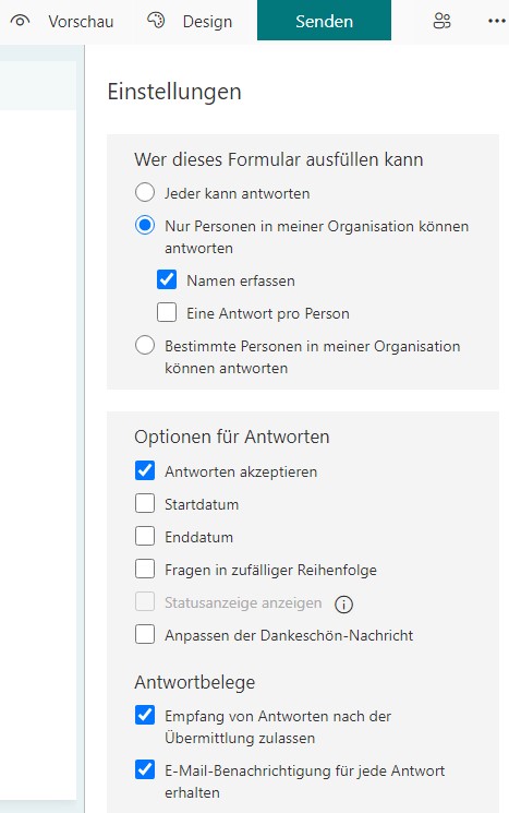 Sie können noch weitere Einstellungen vornehmen, indem Sie oben rechts auf die drei Punkte klicken und dann Einstellungen auswählen. Über diese Einstellungen können Sie einstellen, wer auf die Umfrage antworten darf, ob es ein Enddatum gibt oder auch die Dankeschön-Nachricht anpassen.